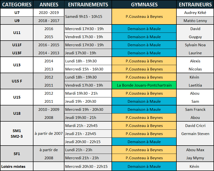 ( ces différents horaires sont susceptibles d’être modifiés en début de saison, en fonction du nombre de licence et des confirmations des créneaux de gymnase)